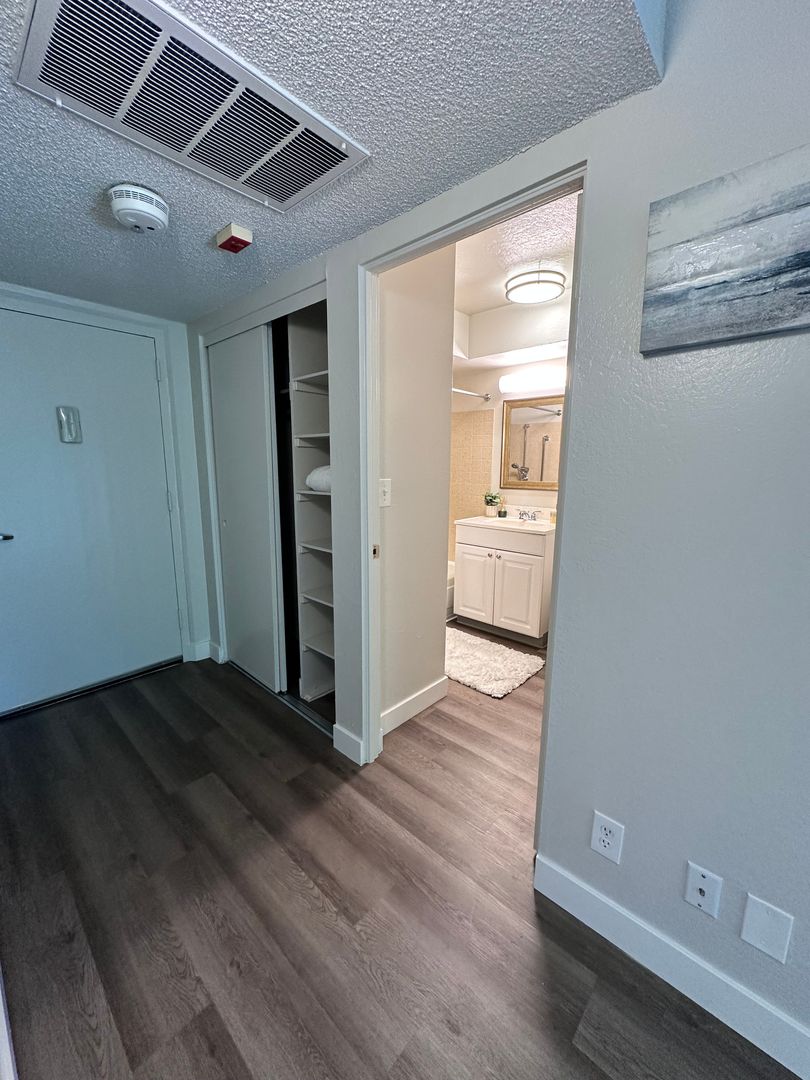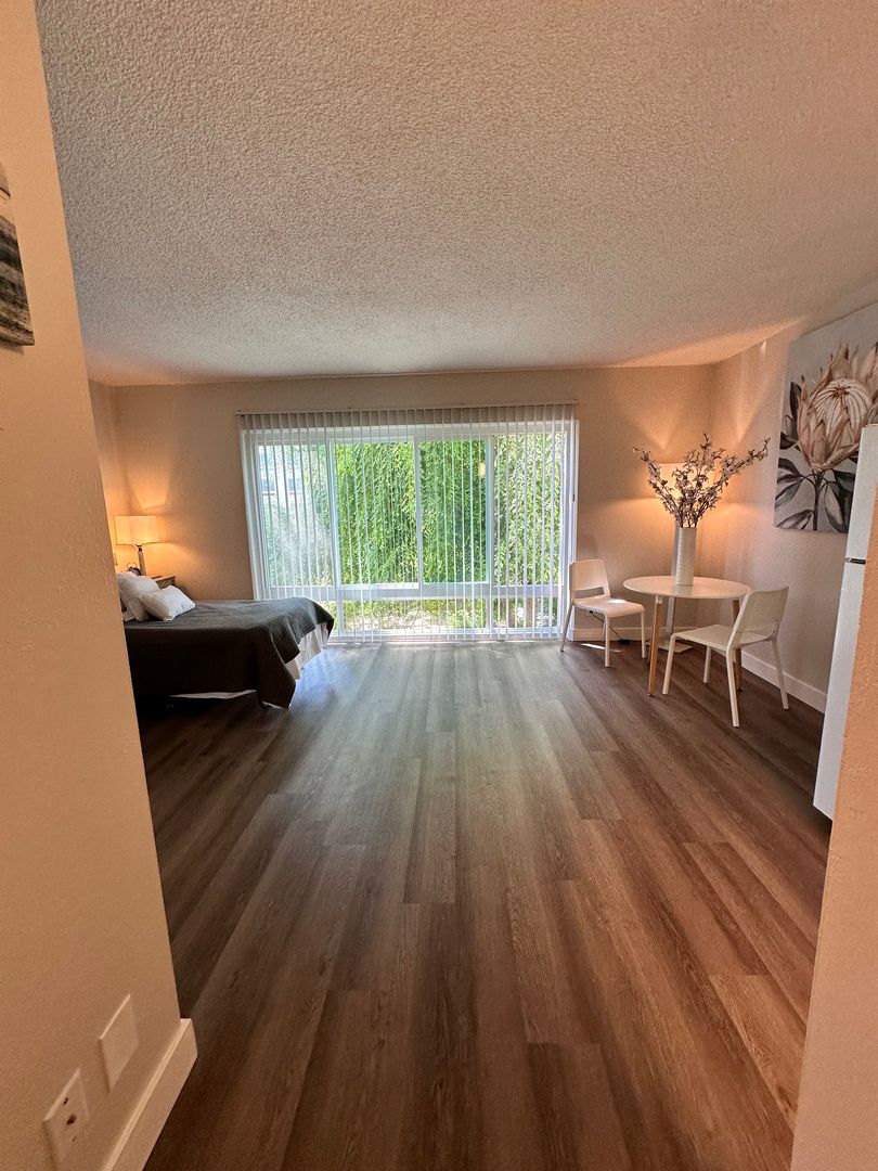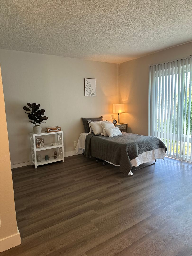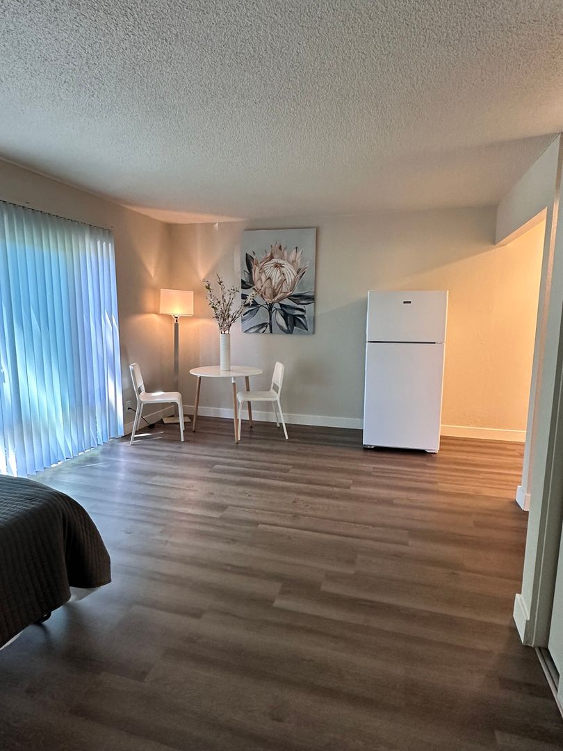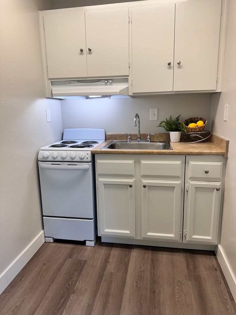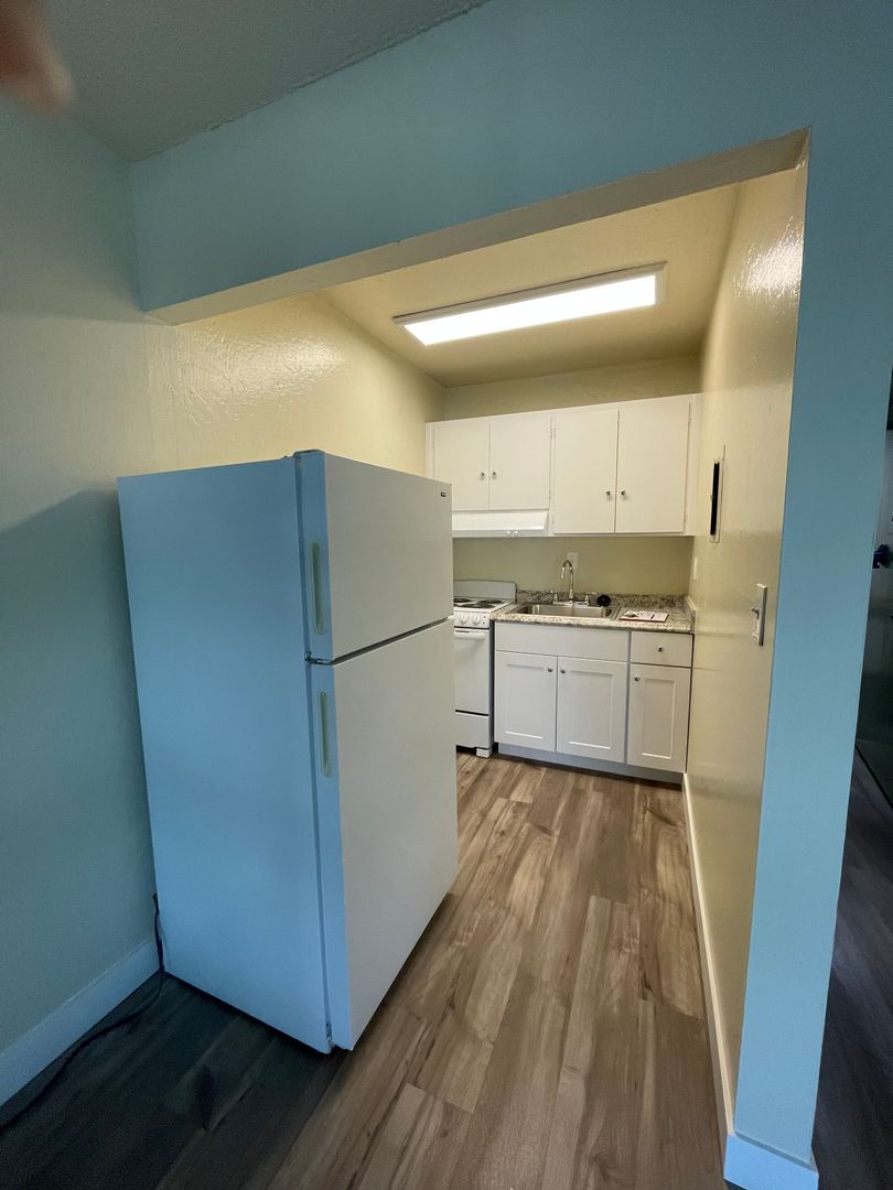 This apartment home features a living space open to a compact kitchen. As you walk into the apartment, there is a midsize coat and a linen closet. The kitchen includes cabinet space, an electric range, garbage disposal, and a full size refrigerator. The living area features a large double paned window, a generous wardrobe closet, and an emergency pull cord. For your convenience, the bathroom has an emergency pull cord, grab bars, and includes a shower wand in the shower. Rent includes one meal per day, utilities, and cable service.